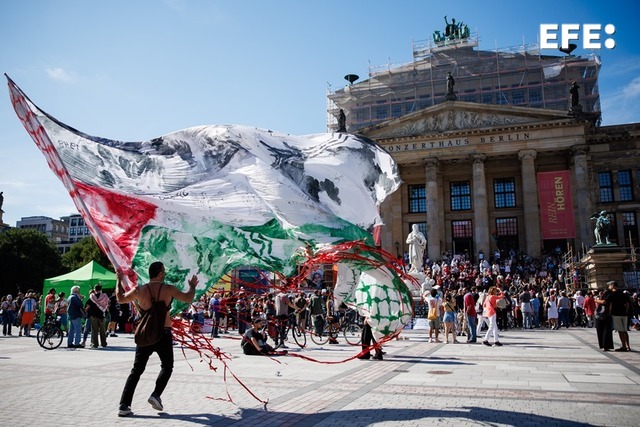 Un participante ondea una bandera palestina gigante durante un concierto por los niños en Gaza en Berlín, el 20 de septiembre de 2025. EFE/EPA/CLEMENS BILAN