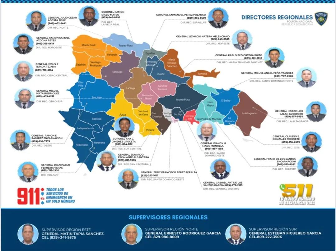 La Policía Nacional puso en circulación un mapa interactivo que permite a la ciudadanía identificar y contactar de manera directa a los 19 directores regionales responsables de la seguridad en todo el territorio nacional, como parte de su estrategia de transparencia, proximidad y fortalecimiento del servicio durante el asueto de Semana Santa 2026.