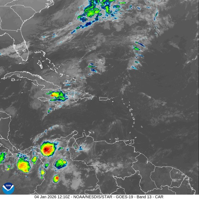 Señaló que, entrada la noche, la aproximación de la vaguada y el sistema frontal incrementará la humedad y la inestabilidad atmosférica, favoreciendo la ocurrencia de aguaceros, que podrían ser de moderados a fuertes, con tormentas eléctricas y ráfagas de viento.