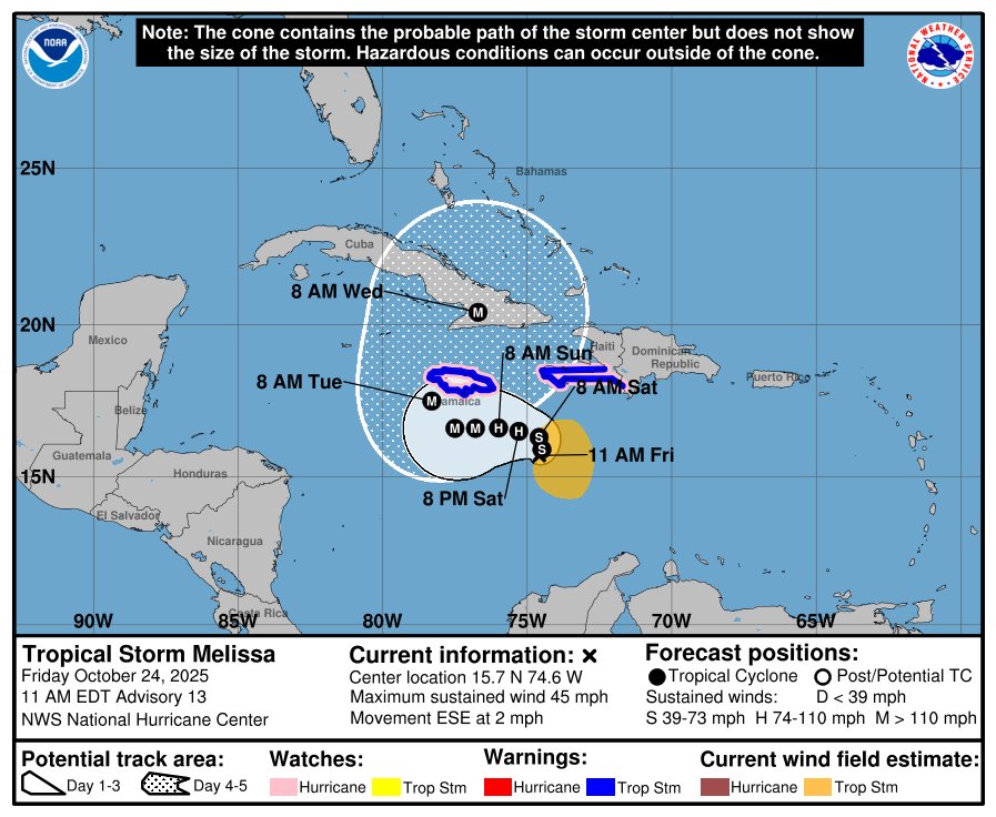Melissa aumentó sus vientos máximos sostenidos a 95 km/h, con ráfagas superiores. Se pronostica un fortalecimiento gradual en las próximas 24 a 36 horas, seguido de una intensificación rápida durante el fin de semana, esperándose que se convierta en huracán la noche del sábado.