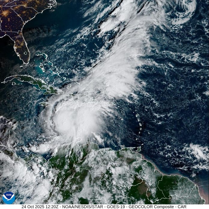 El Indomet precisó que, a las 8:00 a. m., la tormenta tropical Melissa se localizaba a unos 415 km al suroeste de Puerto Príncipe, Haití, y a unos 300 km al sureste de Kingston, Jamaica. Actualmente, permanece casi estacionaria, moviéndose apenas a 2 km/h, hacia el este/ sureste, con vientos máximos sostenidos de 75 km/h y ráfagas superiores, se prevé un fortalecimiento gradual en las próximas horas.