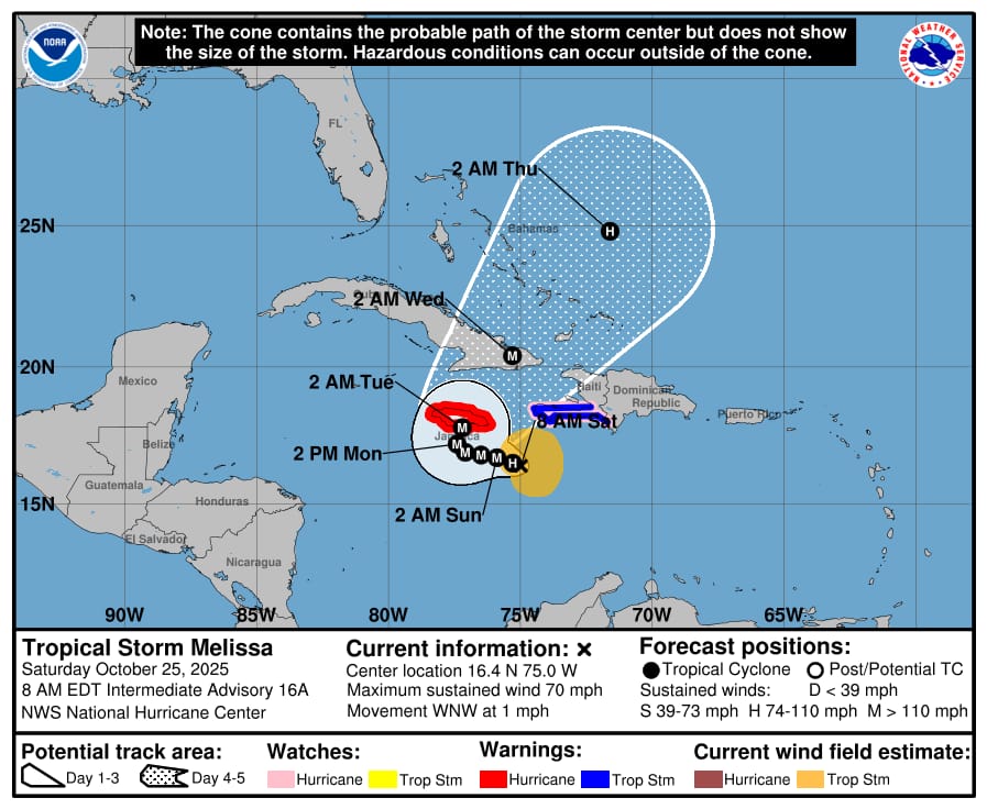 El organismo informó, que a las 8:00 a.m., de este sábado, la tormenta tropical Melissa se localizó a unos 375 kilómetros al suroeste de Puerto Príncipe, Haití, y a unos 260 km al sureste de Kingston, Jamaica. Se desplaza hacia el oeste/noroeste a unos 2 km/h y mantiene vientos máximos sostenidos de 110 km/h, con ráfagas superiores.